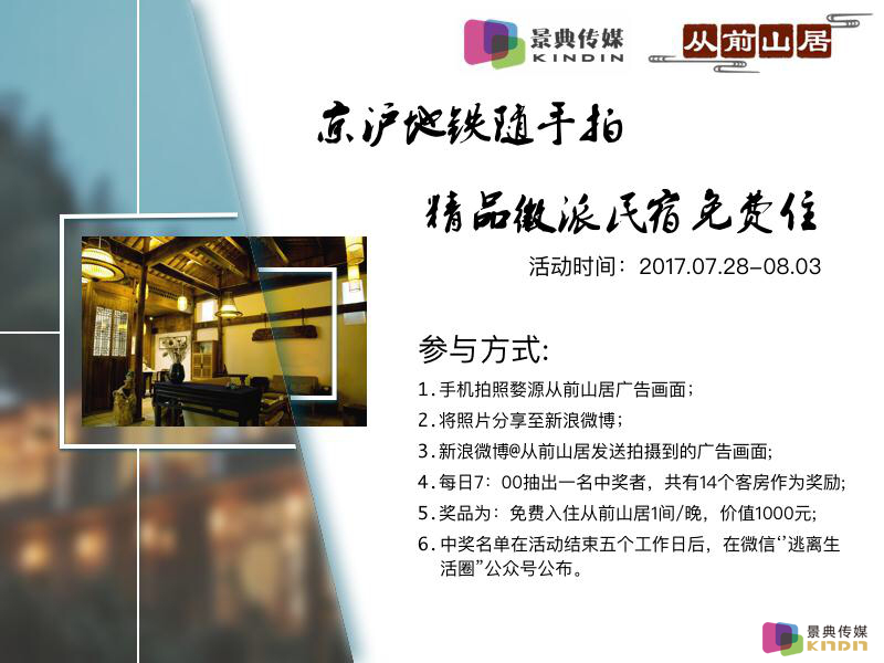 近日,景典传媒把地铁隧道广告又玩出新花样,乘客在乘坐北京地铁一号线从天安门到东单的站点,可参与与婺源从前山居民宿推出“地铁随手拍”活动,拍广告发布微博并@从前山居,即可有机会获得价值1000元的旅游产品。地铁隧道广告与线上抽奖互动结合起来,应该是史上第一个民宿企业以这样的营销方式推向市场。