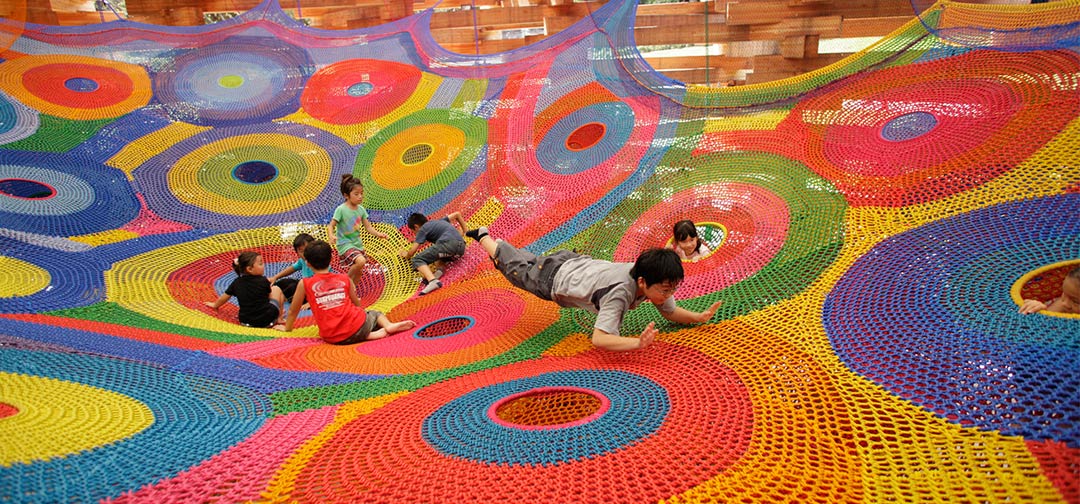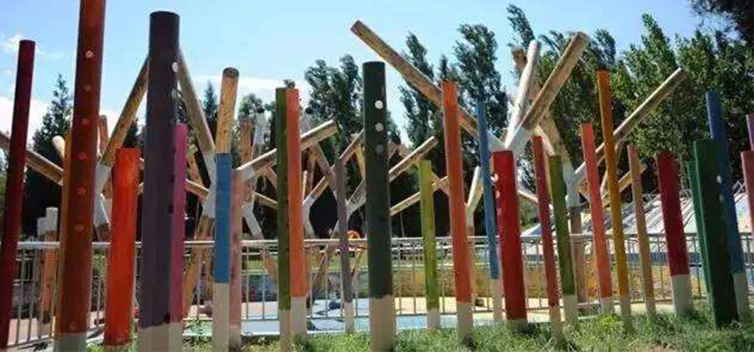 小家伙的好奇心总是非常强烈的,攀爬在七彩编制而成的网状云朵上,去看看那梧桐树尖上的世界。游乐场里充满趣味和艺术感,这五彩缤纷的颜色使生活显得更加有趣和活泼。