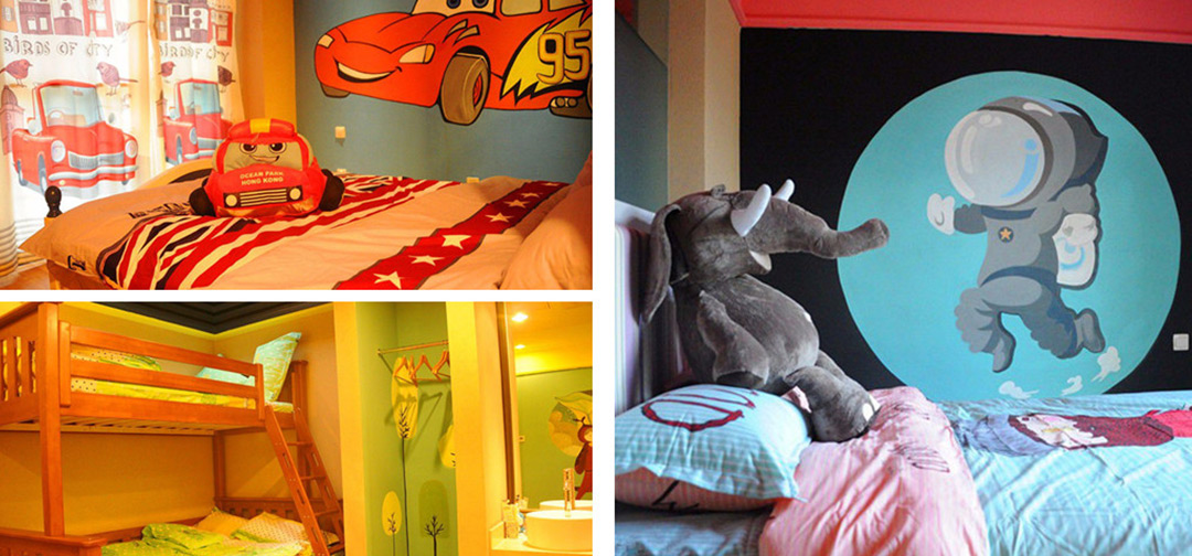 亲子特色的酒店套房,融合了各种卡通元素,专设的亲子客房区分为卡通房和亲子房,其中卡通房装饰梦幻烂漫,熄灯后的荧光天花板尤甚,呈现深邃的宇宙空间;亲子房特别精心准备了双层儿童床,上下铺的设计,让带一家三口都能住得更舒适。