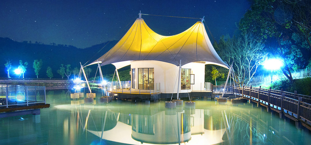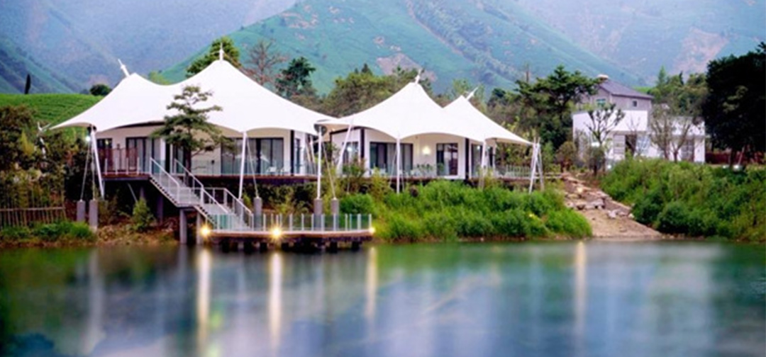 在万亩茶园间的帐篷别墅里,在一个只属于你的空间里,将身体浸泡在伴有安吉白茶的雨水池中,闻着安吉白茶自然散发的清新香味,上万亩茶园的风光美景,享悠闲宜人的野奢生活。