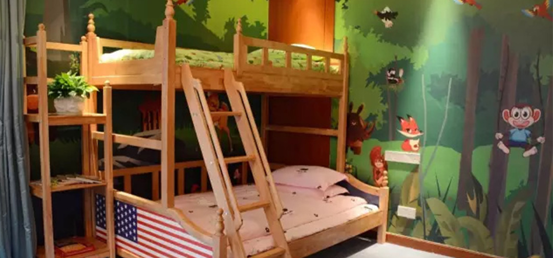 套房面积达80平方米,绝美山景景观,配备儿童专用上下铺床,卡通床和双人大床主卧,户内淋浴房及超大型号浴缸。亲子套房布置优雅,半开放式浴室内置超大浴缸。为2岁以上儿童准备的绿色系的童话森林主题的独立卧房,室内装修风格充满童趣和卡通动物形象。