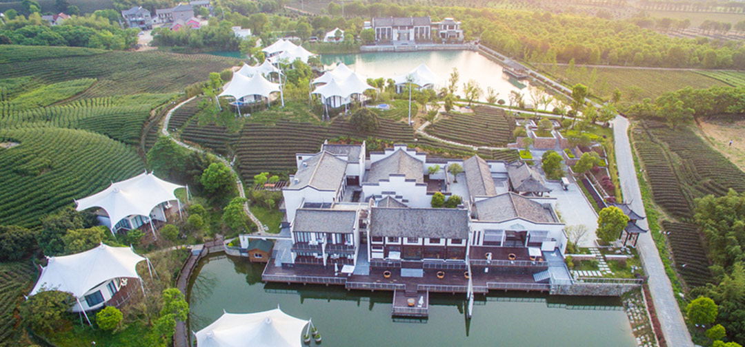 在万亩茶园间的帐篷别墅里,在一个只属于你的空间里,将身体浸泡在伴有安吉白茶的雨水池中,闻着安吉白茶自然散发的清新香味,上万亩茶园的风光美景,享悠闲宜人的野奢生活。