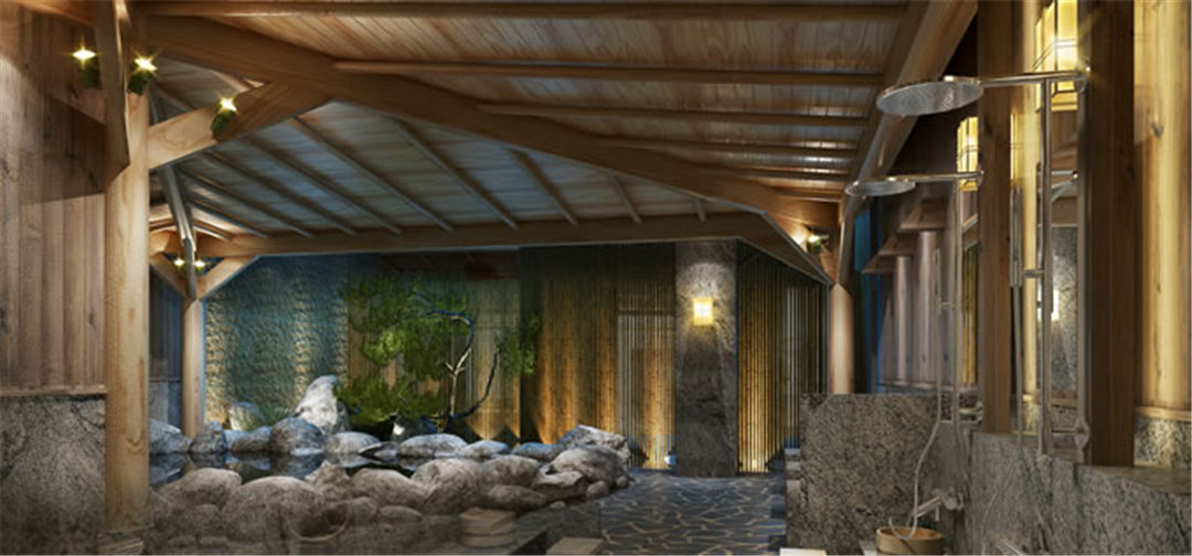 男汤以“岩”为设计主题,由岩石汤池、沐浴区、桑拿房和更衣区组成。