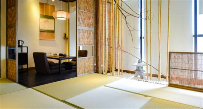 禅意庭院的客堂大面积采用木料、土墙等古朴的材质,作为朱里俱舍作品展示空间。酒店共有16间客房、4种房型。禅房8间,套房2间,豪华套房2间,二卧套房4间,套内净面积从30平方米、60平方米至90平方米不等,全部客舍均为日系风格,营造出私密、禅意、低调、奢华的空间气质。