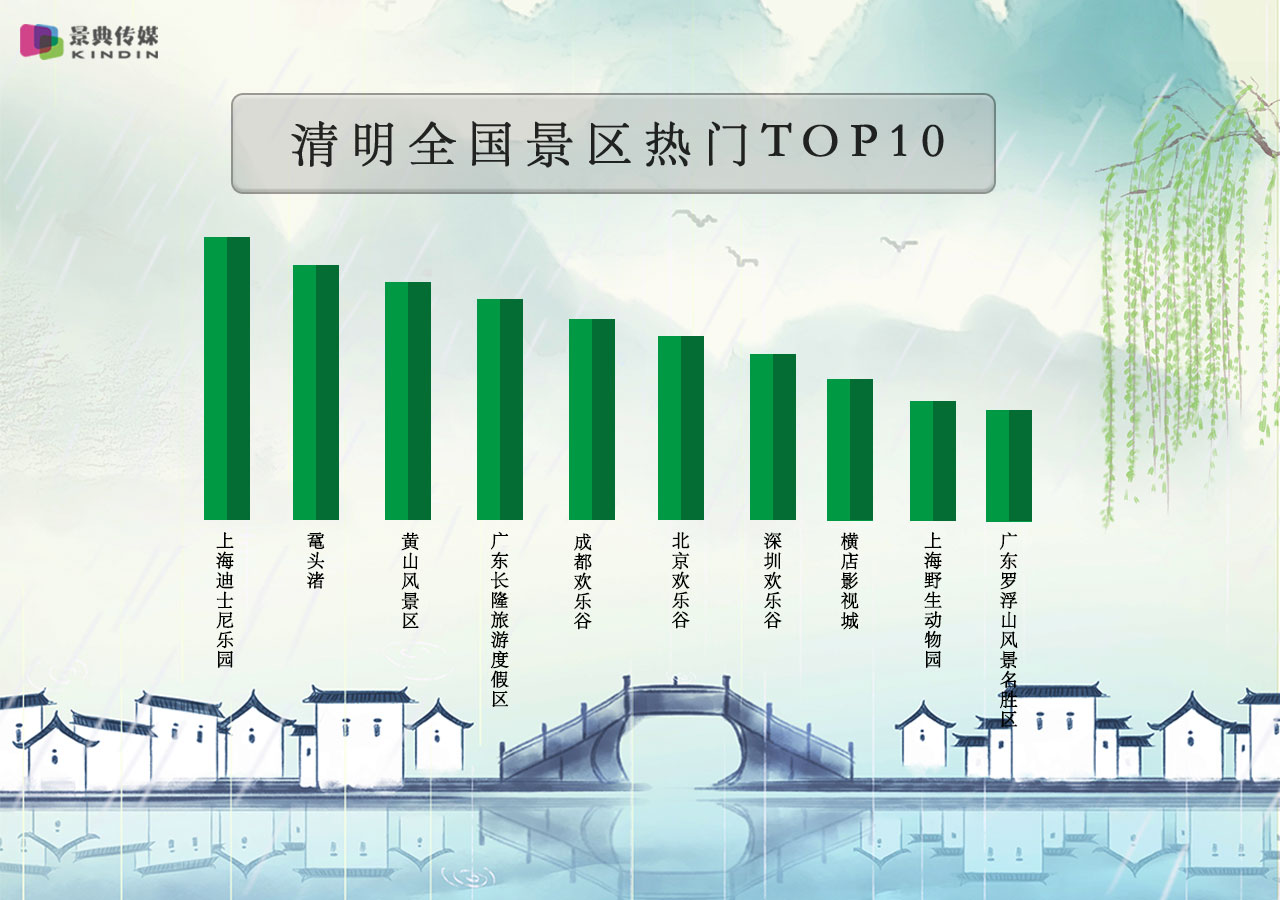 景典传媒汇报今年清明假期中,全国十大热门景区分别是上海迪士尼乐园、鼋头渚、黄山风景区、广东长隆旅游度假区、成都欢乐谷、北京欢乐谷、深圳欢乐谷、横店影视城、上海野生动物园和广东罗浮山风景名胜区。
