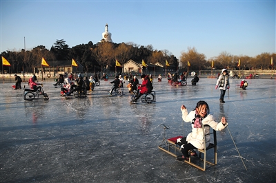 颐和园冰场除了受追捧的冰滑梯外,单人双人冰车、冰上自行车等也颇受欢迎。负责人介绍,今年共推出10个冰上娱乐项目,总数达6000件。