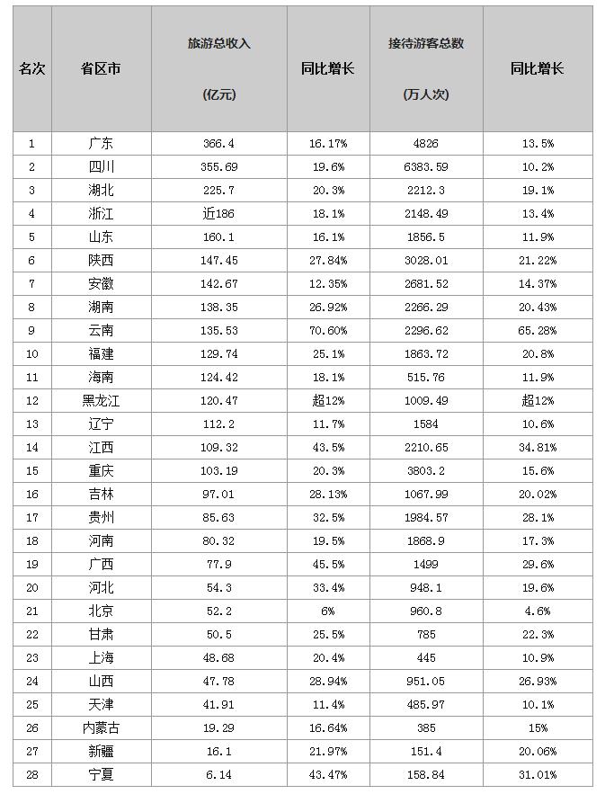 说明:本表采用的是各省区市旅游局/委公开统计数据,各省市区统计涵盖范围或有不一。